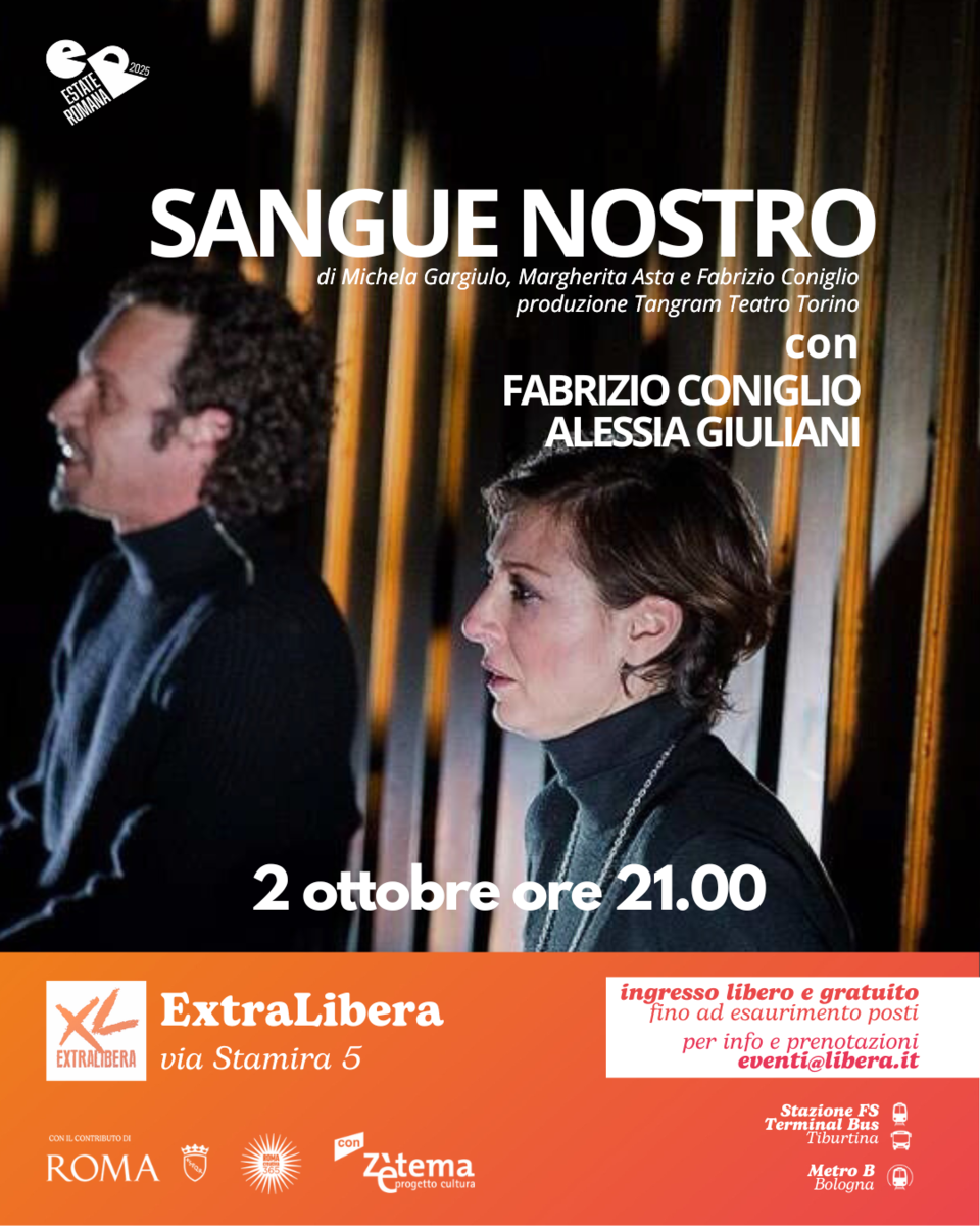 Alle ore 21.00 in scena lo spettacolo teatrale “Sangue Nostro” di Michela Gargiulo, Margherita Asta e Fabrizio Coniglio.
