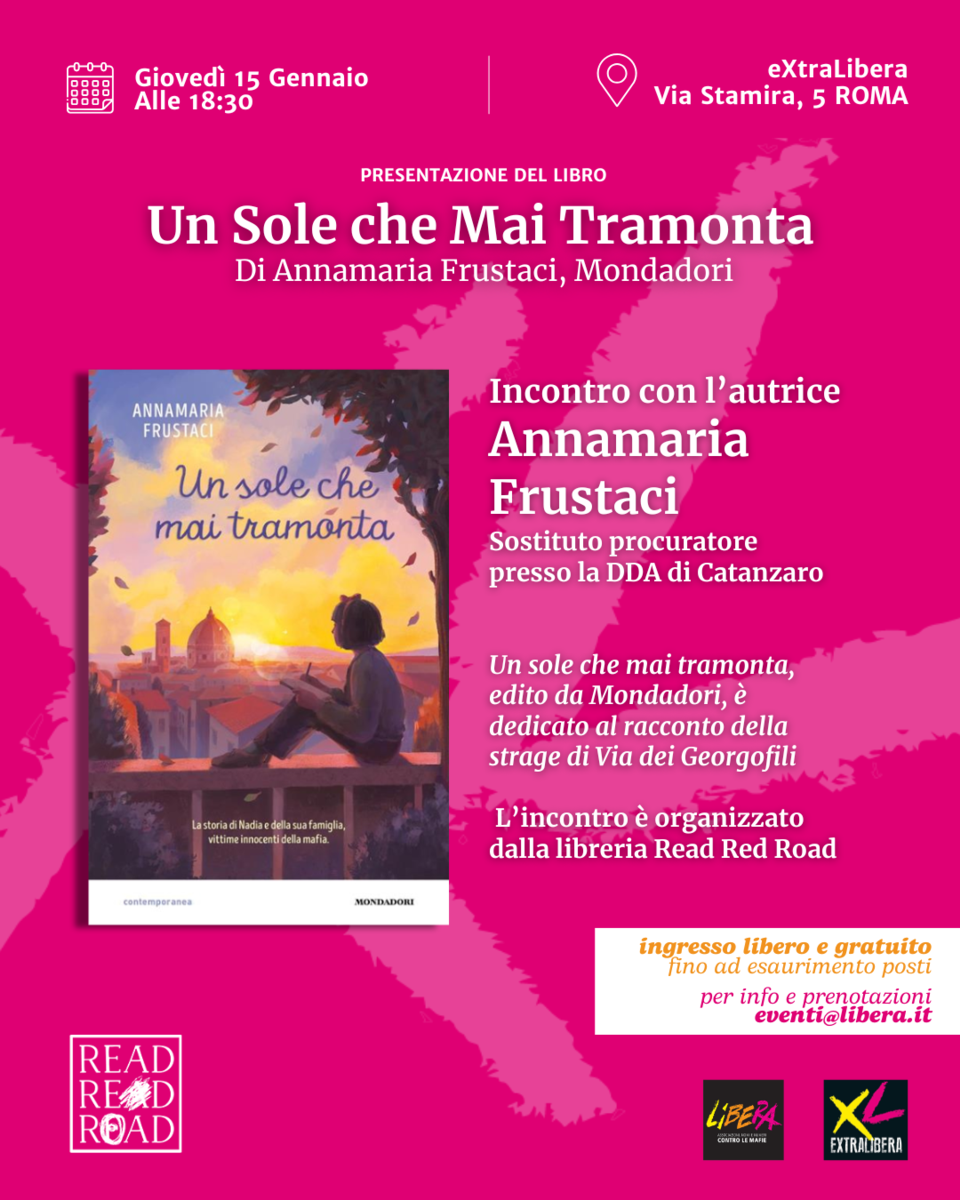 il 15 gennaio 2026 alle ore 18.30 ExtraLibera ospita la libreria Read Red Road per presentazione del libro Un sole che mai tramonta, edito da Mondadori, e dedicato al racconto della strage di Via dei Georgofili. Sarà presente l'autrice, la magistrata Annamaria Frustaci, sostituto procuratore presso la DDA di Catanzaro.